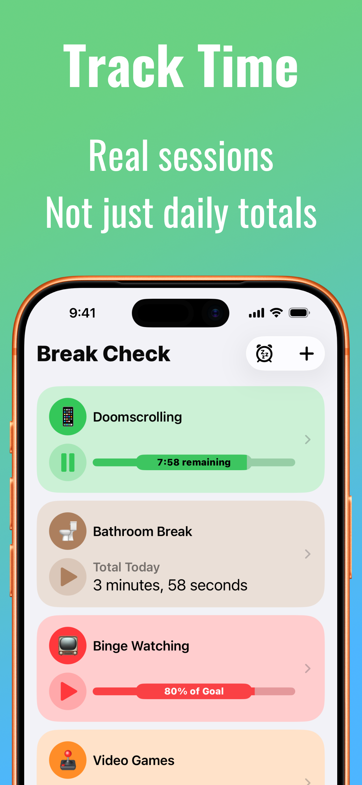 Set a session length and a daily goal for any habit. Break Check records each session separately so you can see patterns across the day rather than collapsing everything into one number. Pause and resume any timer right where you left off.