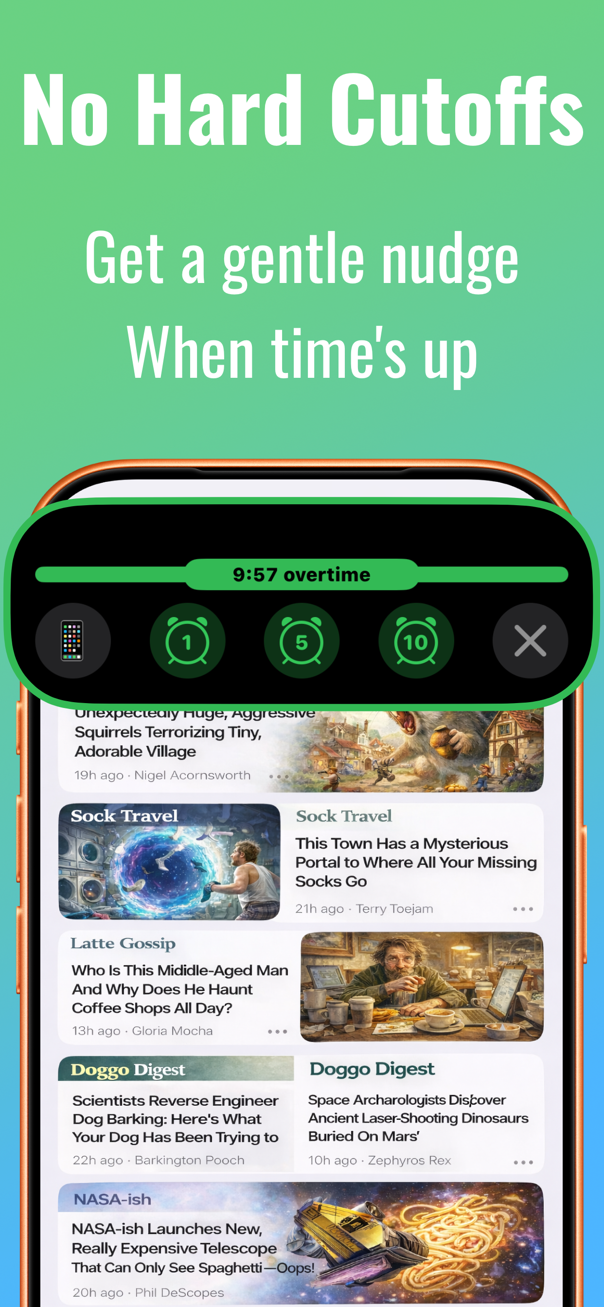When a session ends, a gentle notification lets you know and the timer starts counting up. You can keep going, or tap to extend by 1, 5, or 10 minutes without any friction. The app never locks you out or forces a choice that makes you resent it.