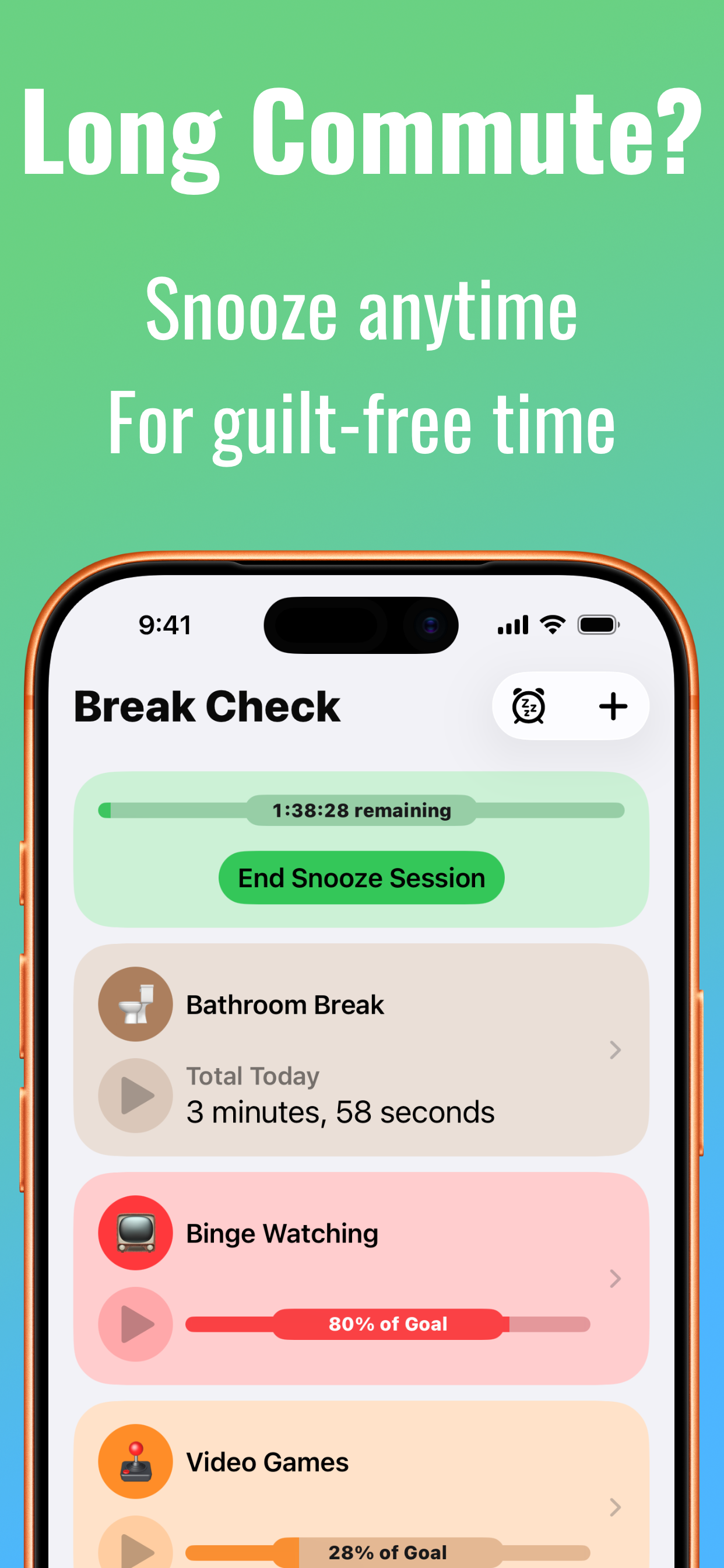 Waiting at the DMV, stuck on a long commute, delayed at the airport? Snooze all timers at once for a window of untracked time. No streaks broken. No guilt. Just an honest acknowledgment that some situations are different, with a clear countdown until normal tracking resumes.