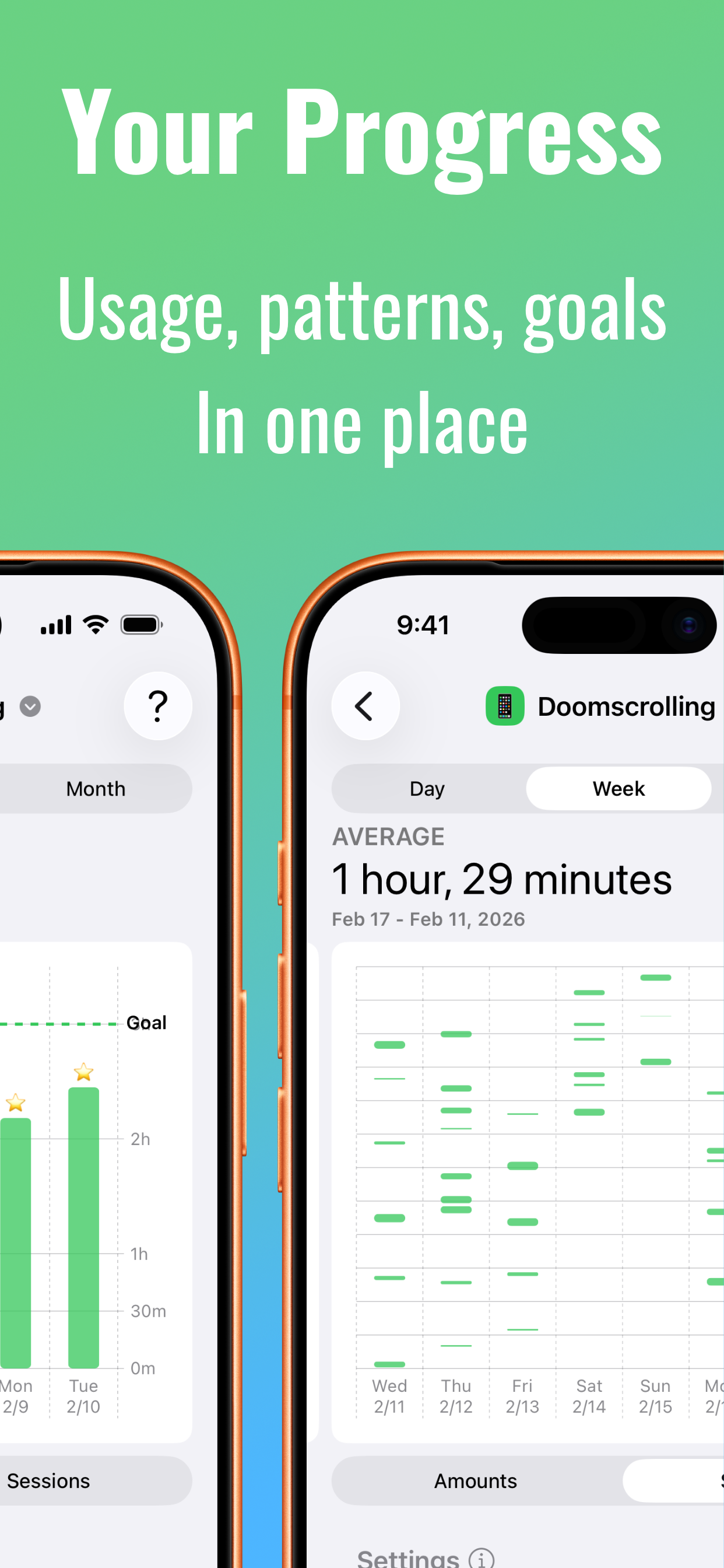 Switch between day and week views to spot when you reach for your phone most. See how each habit is trending against your goal over time. The stats are designed to surface insights that feel actionable, not just numbers to feel bad about.